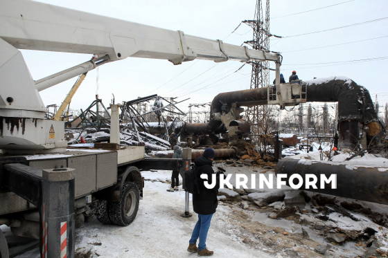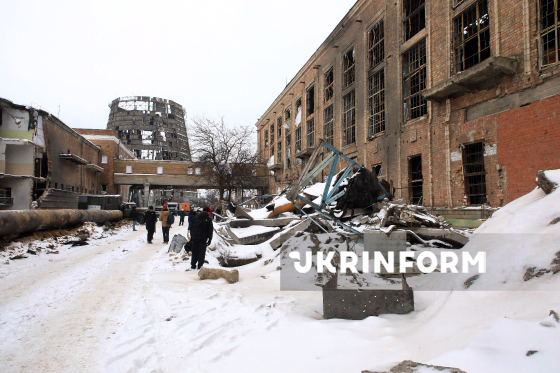 Представники ЗМІ оглядають наслідки руйнувань Київської ТЕЦ-4, яка після масованої російської атаки у ніч на 3 лютого зупинила роботу, Київ, 6 лютого, 2026 року. У ніч з 2 на 3 лютого війська РФ атакували теплове господарства Київської ТЕЦ-4 (Дарницької ТЕЦ) п`ятьма балістичними ракетами. Станція зазнала критичних руйнувань і була повністю зупинена. Без опалення та гарячої води за температури повітря -25°C залишилися 1129 житлових будинків Дніпровського та частини Дарницького районів, 46 шкіл, 72 дитячі садки, 18 медичних закладів та інші об`єкти соціальної і міської інфраструктури.