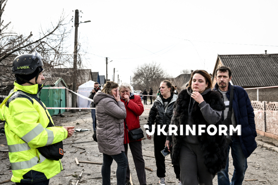 Жінки плачуть неподалік місця влучання російського безпілотника у приватний будинок в одному з районів Запоріжжя, 21 березня 2026 року. Внаслідок обстрілу загинуло двоє мирних жителів, ще кілька людей отримали поранення, серед них - діти.