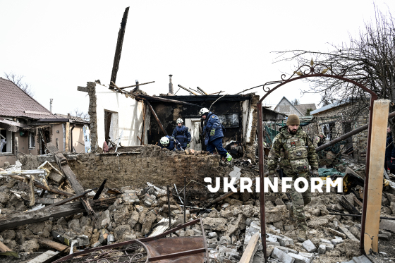 Рятувальники у пошуках загиблих працюють на місці влучання російського безпілотника у будинок в приватному секторі в одному з районів Запоріжжя, 21 березня 2026 року. Внаслідок обстрілу загинуло двоє мирних жителів, ще кілька людей отримали поранення, серед них - діти.