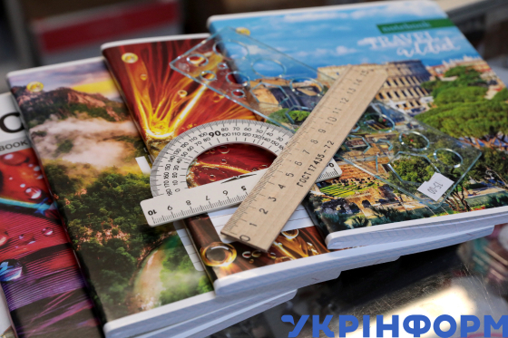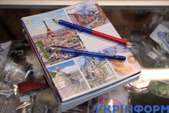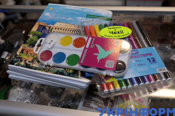 Шкільні зошити та набори фарб і фломастерів продаються у магазині, Київ, 29 серпня 2025 року.