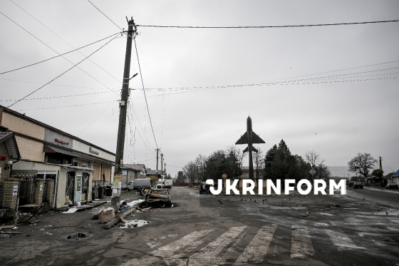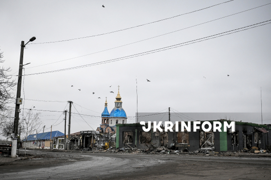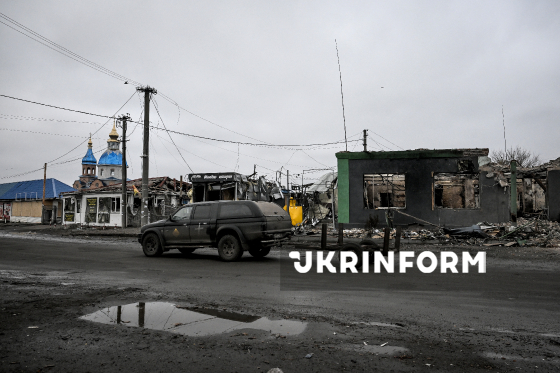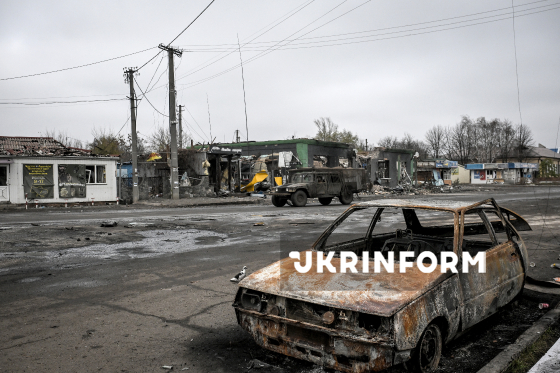 Військовий автомобіль проїжджає повз знищені внаслідок російських обстрілів магазини на ринку у прифронтовому селищі Покровське, Синельниківський район, Дніпропетровська область, 11 листопада 2025 року. Війська РФ ледь не щодня атакують населений пункт авіабомбами та ударними безпілотниками. Звідки до фронту - близько 13 км. У селищі, в якому донедавна проживало майже 13 тисяч людей, залишилося - менше тисячі.