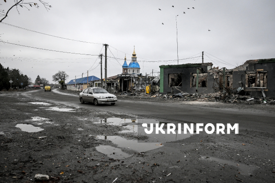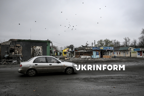 Автомобіль проїжджає повз знищені внаслідок російських обстрілів магазини на ринку у прифронтовому селищі Покровське, Синельниківський район, Дніпропетровська область, 11 листопада 2025 року. Війська РФ ледь не щодня атакують населений пункт авіабомбами та ударними безпілотниками. Звідки до фронту - близько 13 км. У селищі, в якому донедавна проживало майже 13 тисяч людей, залишилося - менше тисячі.