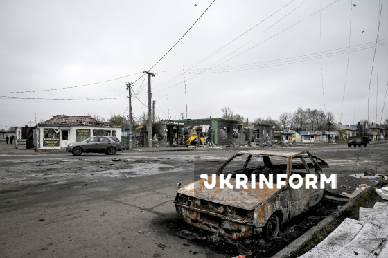 Згорілий легковий автомобіль стоїть на узбіччі дороги на тлі зруйнованих внаслідок російського обстрілу магазинів на ринку у прифронтовому селищі Покровське, Синельниківський район, Дніпропетровська область, 11 листопада 2025 року. Війська РФ ледь не щодня атакують населений пункт авіабомбами та ударними безпілотниками. Звідки до фронту - близько 13 км. У селищі, в якому донедавна проживало майже 13 тисяч людей, залишилося - менше тисячі.