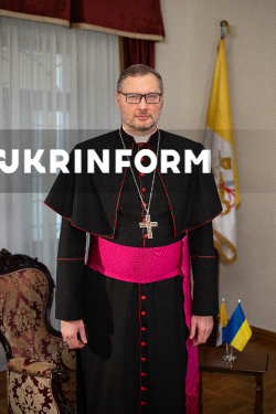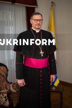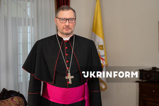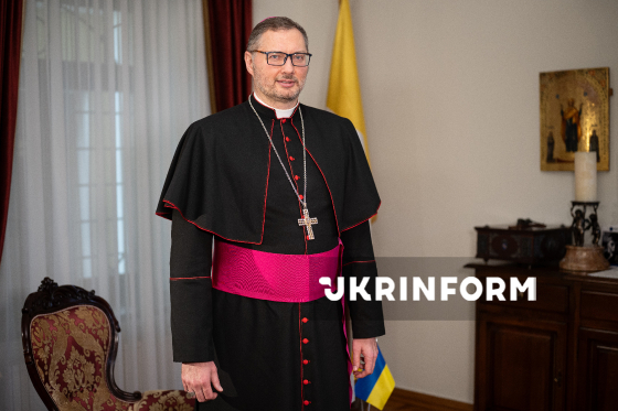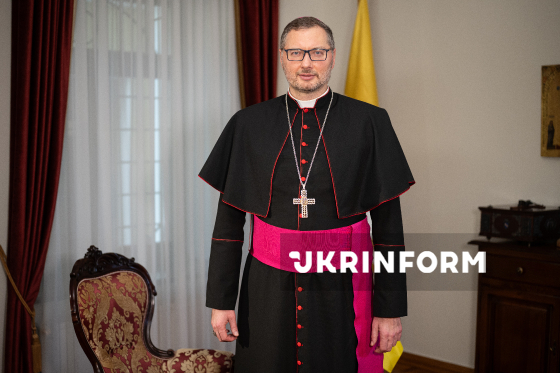 Апостольський нунцій в Україні архієпископ Вісвальдас Кульбокас позує для фото у межах запису програми Укрінформу “Є Розмова”, Київ, 11 березня 2026 року.