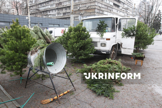 Дерева, що продаються на ялинковому базарі, на перетині проспектів Олександра Поля та Лесі Українки Дніпро, 12 грудня 2025 року. У місті запрацювали ялинкові базари, де мешканці можуть придбати легальні святкові дерева. Загалом в місті розгорнули 70 точок.