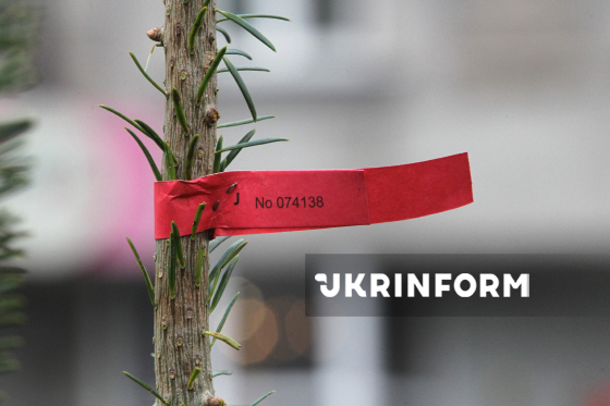 Бирка на дереві, що продається на ялинковому базарі, на перетині проспектів Олександра Поля та Лесі Українки Дніпро, 12 грудня 2025 року. У місті запрацювали ялинкові базари, де мешканці можуть придбати легальні святкові дерева. Загалом в місті розгорнули 70 точок.