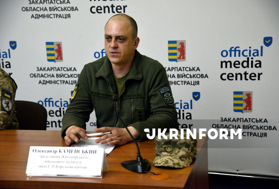 Представник Житомирського військового інституту імені С.П. Корольова капітан Олександр Каменський бере участь у брифінгу на тему: “Військова освіта України: шлях до професії офіцера” у пресцентрі Закарпатської ОВА, Ужгород, 19 березня 2026 року.