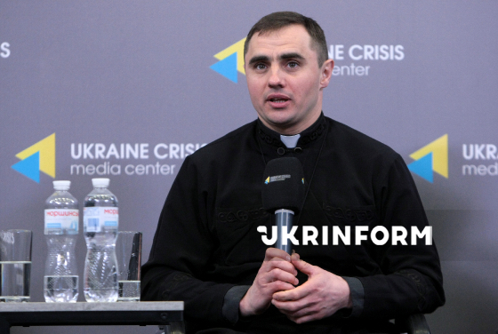 Священник УГКЦ, настоятель храму Різдва Пресвятої Богородиці у м. Мелітополі Запорізької області, депортований окупантами, отець Олександр Богомаз бере участь у публічній розмові “УГКЦ у прицілі російської імперської політики: від Львівського псевдособору до сучасних заборон на тимчасово окупованих територіях” в Українському кризовому медіацентрі, Київ, 5 березня 2026 року.