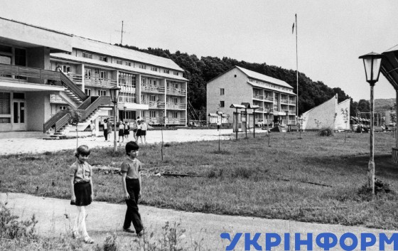 Корпуси на території піонерського табору "Романтик", де оздоровлюються діти-чорнобильці, Київська область, 1990 рік. Фото Галини Удовиченко.