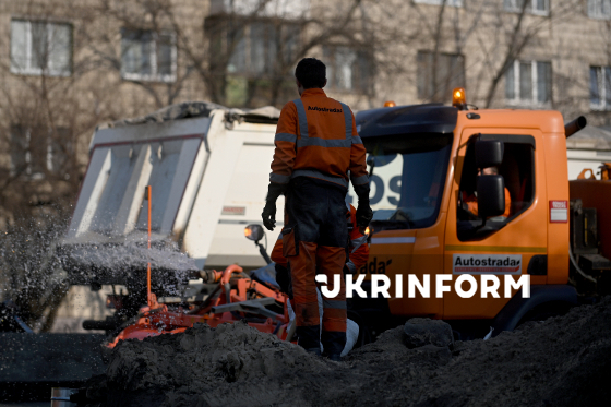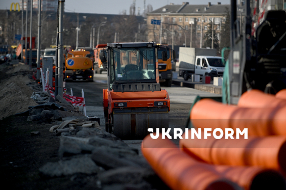 Дорожники ремонтують дорожнє покриття на відрізку Харківського шосе від Дарницької площі до Інституту хімії високомолекулярних сполук НАН України, Київ, 25 березня 2026 року. У межах капремонту планується розширення проїжджої частини до трьох смуг у кожному напрямку, де крайні праві смуги виділені для громадського транспорту. Три підземні переходи біля Інституту хімії та на вулиці Литвинського облаштують ліфтами для маломобільних людей. Також планується облаштування нових тротуарів, велодоріжок, зупинок та оновлення системи дощової каналізації.