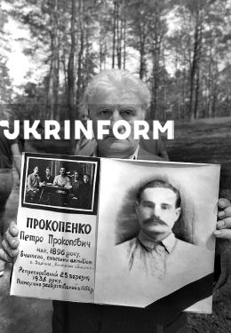 Чоловік тримає фотографії вчителя села Зарічне Вінницької області Петра Прокопенка, репресованого в 1938 році та посмертно реабілітованого в 1956 році, на мітингу вшанування пам’яті жертв сталінських репресій у Биківнянському лісі, Київ, 1989 рік. Фото Олександра Малаховського.