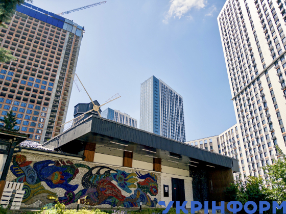 Монументальне мозаїчне панно "Вітер", створене українськими художниками Борисом Плаксієм, Віктором Зарецьким та Аллою Горською у 1967 році, на фасаді колишнього ресторану "Вітряк" на проспекті Академіка Глушкова, 11, Київ, 3 липня 2025 року.