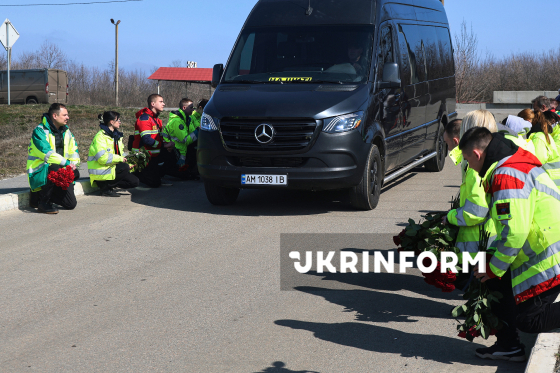 Медики навколішках зустрічають ритуальний автомобіль із тілом 27-річного лікаря-анестезіолога Дмитра Колесника, який загинув унаслідок влучання російського FPV-дрона в автомобіль екстреної швидкої допомоги, на якому перевозили поранених, 15 березня у Куп’янському районі Харківської області, під час церемонії поховання на кладовищі №18 у Харкові, 22 березня 2026 року. Унаслідок атаки РФ також загинув 56-річний екстрений медичний технік Олег Журавльов, а парамедик Олександр Дудулад отримав поранення.