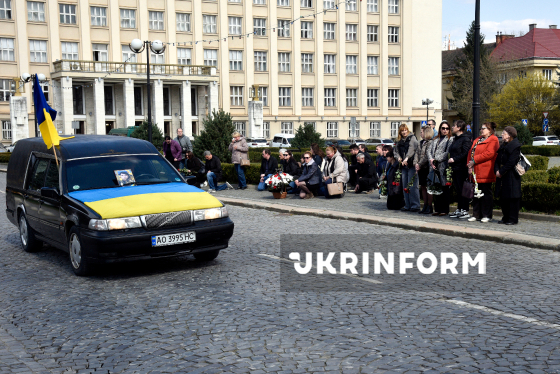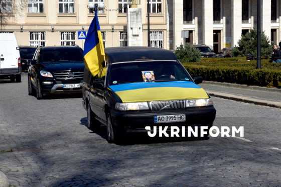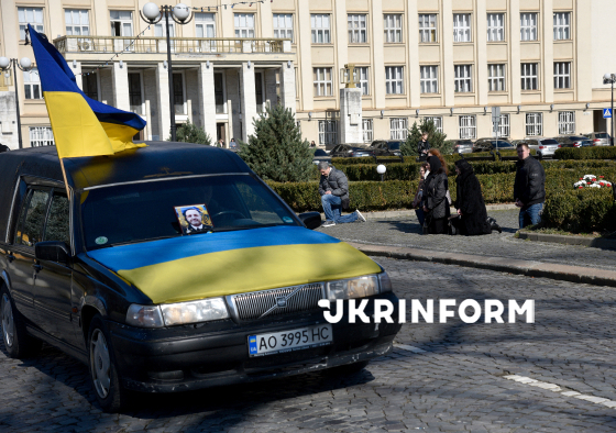 Катафалк із тілом старшого сапера Андрія Жабського їде вулицею Ужгорода під час церемонії прощання, Ужгород, 9 березня 2026 року.