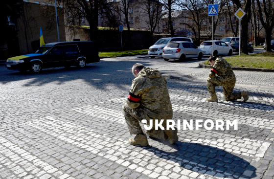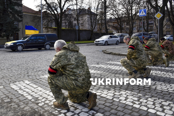 Військовослужбовці навколішках зустрічають катафалк із тілом військового Олександра Сахнюка під час церемонії прощання в Ужгороді, 11 березня 2026 року.