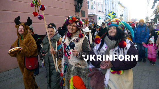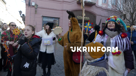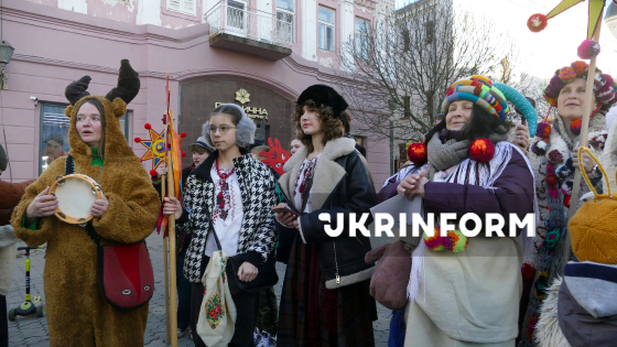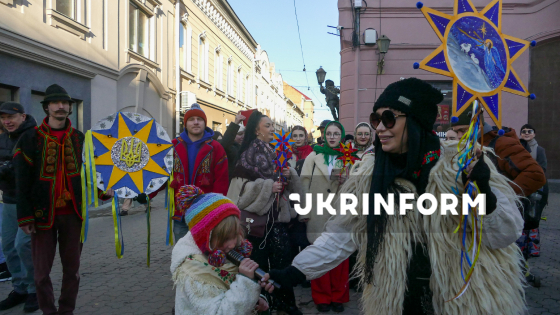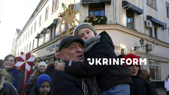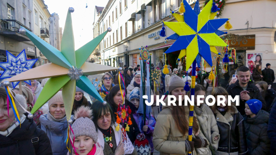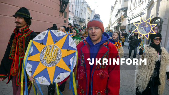 Учасники третьої Ходи звіздарів, під час якої збирали кошти на дрони для українських захисників, крокують з різдвяними зірками вулицями міста, Ужгород, 27 грудня 2025 року.