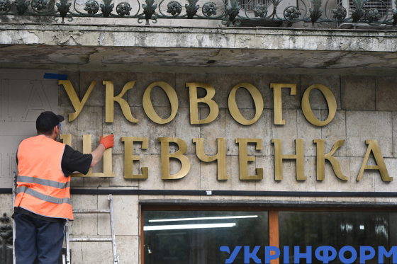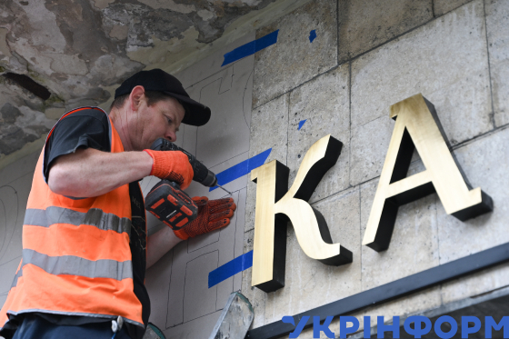 Робітник закріплює на фасаді будівлі Наукового товариства імені Тараса Шевченка відреставровану вивіску, Львів, 22 липня 2025 року.