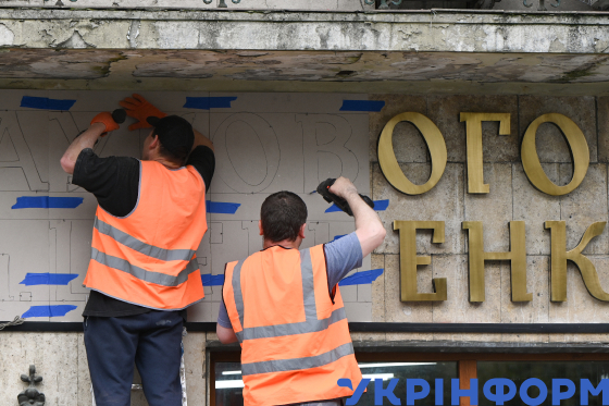 Робітники закріплюють на фасаді будівлі Наукового товариства імені Тараса Шевченка відреставровану вивіску, Львів, 22 липня 2025 року.