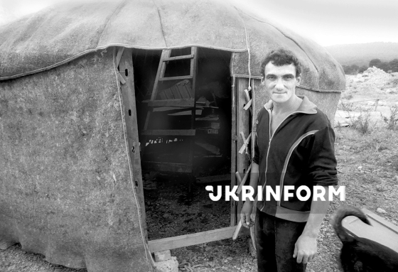 Кримський татарин, який повернувся на історичну батьківщину, стоїть біля тимчасового житла в селищі Чаат-Кая, Кримська область, 1990-ті роки. Фото Сергія Гутієва.