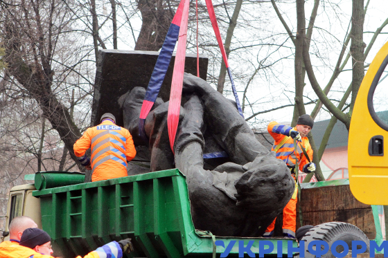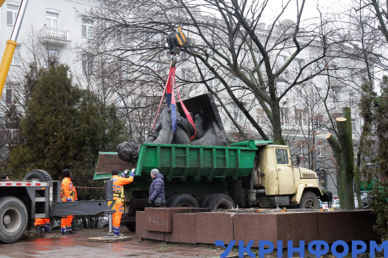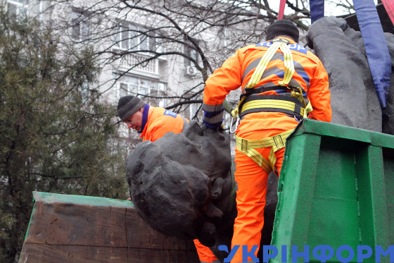 Працівники комунальної служби за допомогою автокрана завантажують демонтований на виконання рішення виконкому Дніпровської міської ради в межах дерусифікації та декомунізації топонімів, пов’язаних із країною-терористом рф, пам’ятник радянському письменнику Максиму Горькому в кузов самоскиду на вулиці Княгині Ольги, Дніпро, 26 грудня 2022 року.