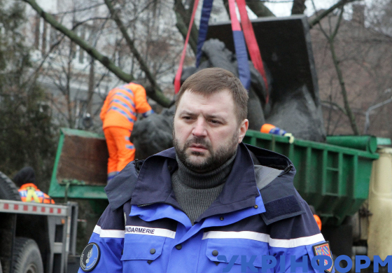 Заступник міського голови Дніпра Михайло Лисенко під час демонтажу на виконання рішення виконкому Дніпровської міської ради в межах дерусифікації та декомунізації топонімів, пов’язаних із країною-терористом рф, пам’ятника радянському письменнику Максиму Горькому на вулиці Княгині Ольги, Дніпро, 26 грудня 2022 року.