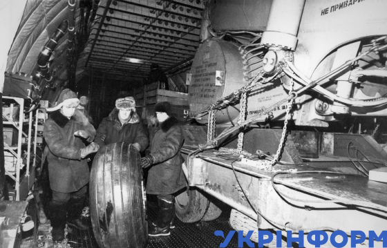 У вантажному відсіку транспортного літака Ан-124 "Руслан" під час вивантаження модуля самоскиду в аеропорту "Полярний", Удачний, Якутія, грудень 1995 року. Фото Володимира Репіка.