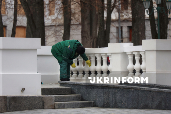 Комунальник протирає ганчіркою огорожу фонтана "Дзеркальний струмінь", прикрашеного інсталяцією у вигляді метеликів, Харків, 4 березня 2026 року. Харків готується до весняних свят, місто прикрашають квітковими декораціями та тематичними інсталяціями.