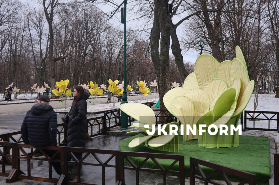 Елементи інсталяції, встановленої в середмісті Харкова, 4 березня 2026 року. Харків готується до весняних свят, місто прикрашають квітковими декораціями та тематичними інсталяціями.