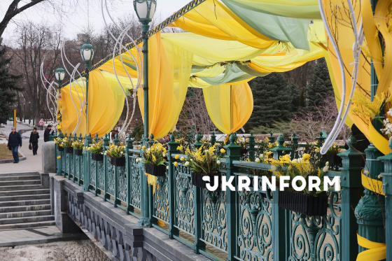 Прикрашена стрічками святкова арка, встановлена середмісті Харкова, 4 березня 2026 року. Харків готується до весняних свят, місто прикрашають квітковими декораціями та тематичними інсталяціями.