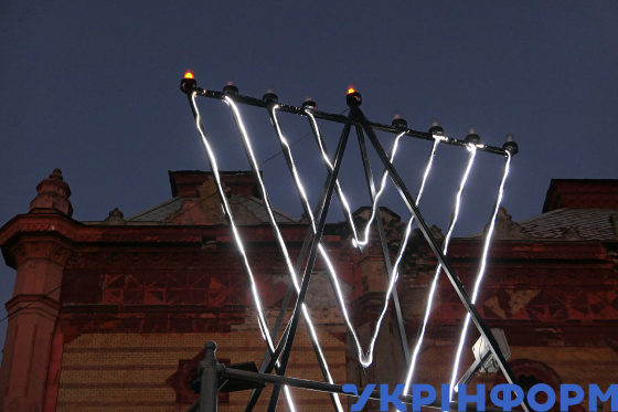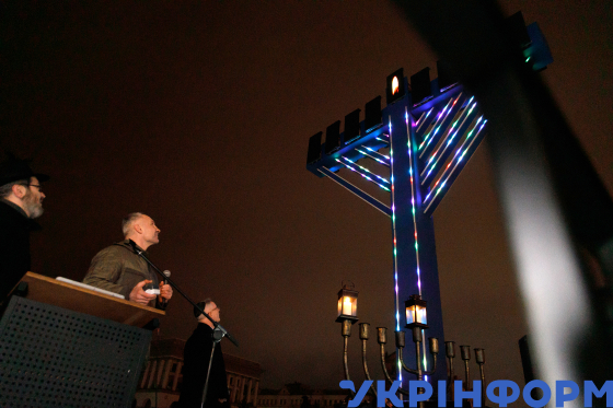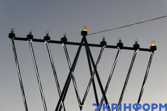 Під час урочистої церемонії запалення свічок на найбільшій в Європі менорі, встановленій на Майдані Незалежності біля Головпоштамту, з нагоди початку святкування Хануки, Київ, 25 грудня 2024 року.