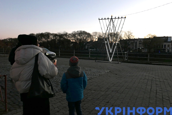 Жінка фотографує підсвічену ханукію, встановлену до єврейського свята Хануки біля будівлі Закарпатської обласної філармонії, Ужгород, 25 грудня 2024 року.
