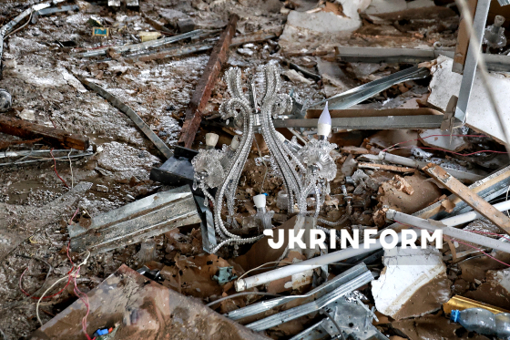 Розбита люстра лежить серед зламаних конструкцій і будівельного сміття у триповерховому будинку, зруйнованому внаслідок російської атаки ударними БпЛА у ніч на 19 березня, Одеса, 19 березня 2026 року. Також частково зруйновано двоповерховий будинок, пошкоджено квартири у 21- та 25-поверхівках, понівечено понад 20 автомобілів. Внаслідок обстрілу постраждали четверо цивільних, двох із них – госпіталізували.
