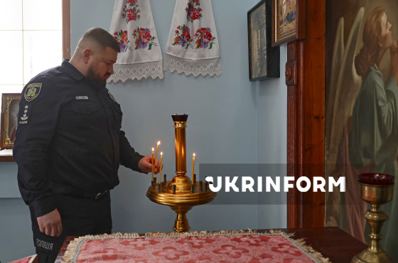 Співробітник Національної поліції України ставить свічку за померлого у храмі Святого Архистратига Михаїла під час поминальної служби за 31-річним поліцейським батальйону поліції особливого призначення "Стрілецький" ГУНП в Харківській області Денисом Жуковим, який загинув під час виконання бойового завдання на Куп`янському напрямку, Харків, 29 грудня 2025 року.