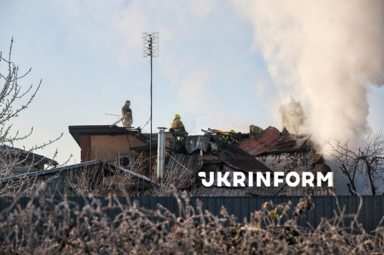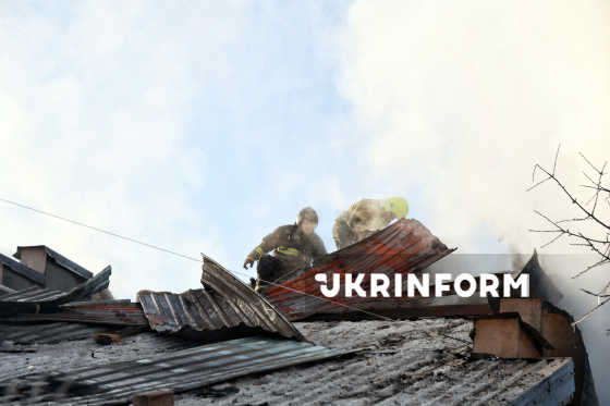 Пожежник ліквідовує пожежу на даху будинку, що виникла внаслідок російської дронової атаки, селище Олександрівка, Одеська область, 21 січня 2026 року.