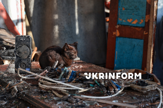 Чорне кошеня сидить біля дверей приватного житлового будинку, який було пошкоджено внаслідок російської дронової атаки, селище Олександрівка, Одеська область, 21 січня 2026 року.