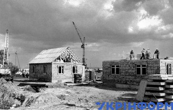 Триває будівництво селища Небрат для трудівників, евакуйованих із колгоспу "Дружба" Чорнобильського району, Київська область, липень 1986 року. Фото Володимира Репіка.
