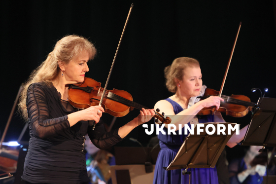 Художня керівниця та концертмейстерка Академічного камерного оркестру “Harmonia Nobile”, народна артистка України Наталія Мандрика грає на скрипці під час творчої зустрічі Tenors BEL`CANTO з концертною програмою “Все про кохання, все про любов….” на сцені Івано-Франківської обласної філармонії імені Іри Маланюк, Івано-Франківськ, 13 лютого 2026 року.
