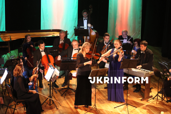 Художній керівник оркестру, народна артистка України Наталія Мандрика (ліворуч) і скрипалька Анжела Приходько виступають під час урочистого ювілейного концерту з нагоди 40-річчя від дня заснування Академічного камерного оркестру Harmonia Nobile на сцені Івано-Франківської обласної філармонії імені Іри Маланюк, Івано-Франківськ, 13 листопада 2025 року.