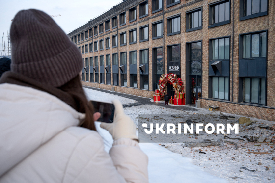 Жінка фотографує всіяну уламками територію, прилеглу до кондитерської фабрики, будівлю якої було пошкоджено внаслідок російського обстрілу, Київ, 24 січня 2026 року. Війська РФ вночі 24 січня масовано обстріляли Київ. Під удар потрапила кондитерська фабрика Roshen, розташована в Голосіївському районі столиці. Уражень зазнали як виробничі, так і офісні приміщення. Окрім потужностей підприємства, були пошкоджені площа з ковзанкою і фонтан. Внаслідок атаки загинула працівниця цеху, ще двоє людей отримали поранення.
