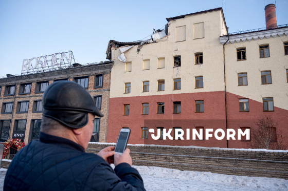 Кондитерська фабрика, пошкоджена внаслідок російського обстрілу, Київ, 24 січня 2026 року. Війська РФ вночі 24 січня масовано обстріляли Київ. Під удар потрапила кондитерська фабрика Roshen, розташована в Голосіївському районі столиці. Уражень зазнали як виробничі, так і офісні приміщення. Окрім потужностей підприємства, були пошкоджені площа з ковзанкою і фонтан. Внаслідок атаки загинула працівниця цеху, ще двоє людей отримали поранення.