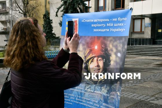 Жінка фотографує стенди вуличної фотовиставки "Вони тримають наш фронт" про закарпатців, які захищають Україну та долають наслідки бойових дій, що відкрилась на Поштовій площі з нагоди четвертих роковин початку повномасштабного вторгнення Росії в Україну, Ужгород, 24 лютого 2026 року. Експозиція складається з 23 стендів, де представлені світлини та історії бійців 128-ї бригади, прикордонників, рятувальників, поліцейських, медиків екстреної допомоги, енергетиків та інших.