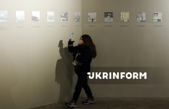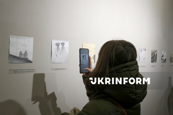 Юна відвідувачка фотографує експонати виставки "Час не потрібен" українського художника, ілюстратора Гамлета Зіньківського, що є продовженням його щоденникового проєкту 365, під час її відкриття у ЄрміловЦентрі, Харків, 24 січня 2026 року.