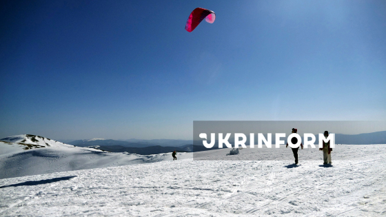 Турист катається на параплані над засніженими схилами гори Гимба (масив Полонина Боржава), Закарпатська область, 14 березня 2026 року.