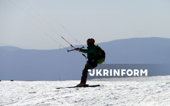 Сноукайтер катається на засніженому схилі гори Гимба (масив Полонина Боржава), Закарпатська область, 14 березня 2026 року.