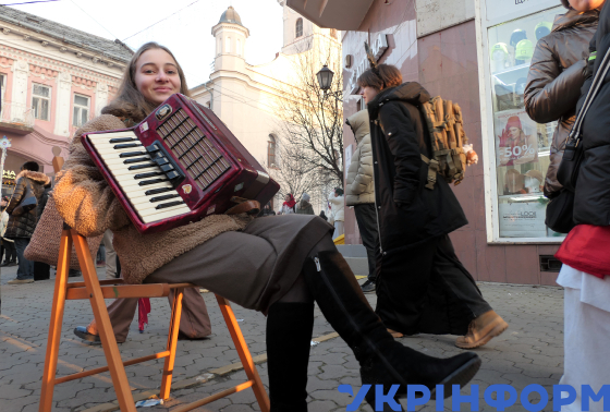 Жінка тримає акордеон під час різдвяної ходи звіздарів, Ужгород, 28 грудня 2024 року.