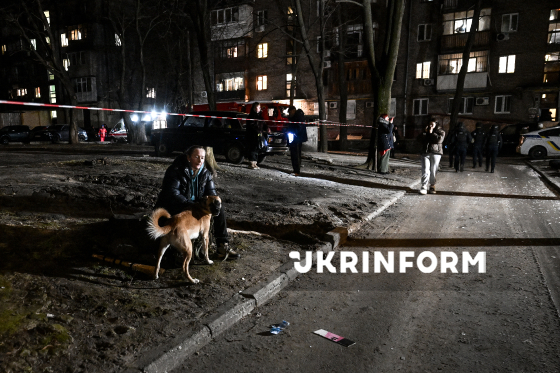 Жінка з собакою сидить біля сигнальної стрічки, якої огороджена територія довкола багатоквартирного житлового будинку, пошкодженого внаслідок російського обстрілу міста БпЛА типу "Shahed" у ніч проти 24 лютого, Запоріжжя, 24 лютого 2026 року.