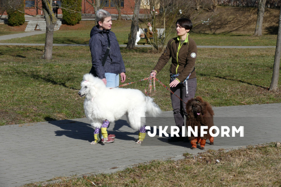 Собаки, взутих у чобітки, на прогулянці біля Міського озера у весняний вихідний день, Івано-Франківськ, 8 березня 2026 року.