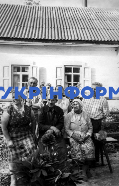 Жителі села Загальці Бородянського району Василь та Олександра Петрусі (на другому плані справа наліво) прийняли родини, евакуйовані з Чорнобильського району після аварії на ЧАЕС, Київська область, травень 1986 року. Фото Олександра Малаховського.
