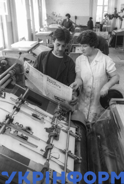 Друкар із Чорнобиля Сергій Швайко та місцевий друкар Катерина Приходько з черговим номером газети "Прапор Перемоги" в Бородянській районній друкарні, Київська область, травень 1986 року. Фото Олександра Малаховського.