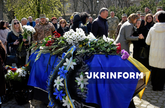 Учасники церемонії прощання з сержантом 94-го прикордонного загону ДПСУ (Чопський прикордонний загін) Василем Голінкою, який загинув 29 січня 2025 року на Курському напрямку, виконуючи бойове завдання, покладають квіти до труни на площі Народній біля памʼятника Тарасові Шевченку, Ужгород, 23 березня 2026 року.